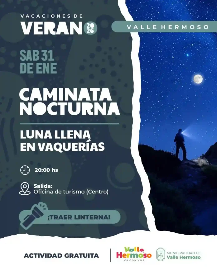 Caminata nocturna en Valle Hermoso desde la Lomita de Vaquerías Qué hay para hacer Por Redacción FacebookTwitterWhatsApp Fecha: 31 de enero Hora: 20:00 Lugar: Punto de encuentro: Oficina de Información Turística – (Av. Gral. Paz y Padre Walter Consalvi – Centro) Actividad gratuita Todas las actividadesQué hay para hacerMás Se va enero, pero la temporada sigue: todo lo que hay para hacer Qué hay para hacer Arranca el último fin de semana de enero, pero... Más info Feria de artesanos de Villa Giardino Qué hay para hacer Fecha: desde el 27 de diciembre (todos los días) Hora:... Más info Museo Ambato de La Falda Qué hay para hacer Viernes y sábados: 10:30 a 13:30 - 17:30 a... Más info Yoga en La Falda Qué hay para hacer Sábado - 8:30 _Plaza San Martín Lunes - 8:00 _Centro Vecinal... Más info Muestra fotográfica en La Cumbre: «Habitar la memoria» Qué hay para hacer Fecha: 31 de enero Hora: 19:30 Lugar: Galería El Paraíso -... Más info Cine para Peques en La Falda Qué hay para hacer Fecha: 31 de enero Hora: 20:00 Lugar: Galpón de la Biblioteca Popular Babel -... Más info Carrera de bicis infantil en La Cumbre Qué hay para hacer Fecha: 24 de enero Hora: 18:00 Lugar: Plaza 25 de Mayo Actividad... Más info Artistas al paso en La Falda Qué hay para hacer Sábados y domingos de enero y febrero Hora: 20:00 Lugar: Avenida... Más info La Falda bajo las estrellas Qué hay para hacer 31 de enero - 21:30: Victoria Alfonsina - Orquesta... Más info