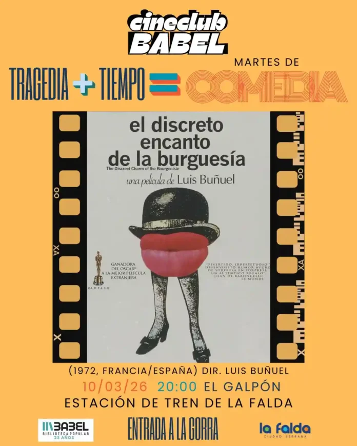 Cine en La Babel: «El discreto encanto de la burguesía» Qué hay para hacer Por Redacción FacebookTwitterWhatsApp Fecha: 10 de marzo Hora: 20:00 Lugar: Galpón de la Biblioteca Popular Babel – Av. España s/n (Estación de tren) Entrada: a la gorra Todas las actividadesQué hay para hacerMás Qué hay para hacer entresemana Qué hay para hacer Te seguimos contando todo lo que hay para hacer... Más info Exposición “Mujeres de La Cumbre” Qué hay para hacer Fecha de inauguración: hasta el 28 de marzo Hora: 19:00 Lugar:... Más info Cine en Capilla del Monte: «Hoppers, operación castor» Qué hay para hacer Fecha: del 5 al 9 de marzo Horarios: Jueves, viernes... Más info Cine Francés en La Cumbre: «Lads» Qué hay para hacer Día: 10 de marzo Hora: 20:00 Lugar: Microcine Sala Caraffa (Tassano... Más info Día de la Mujer en La Cumbre Qué hay para hacer Jueves 12 de marzo 11:00 Encuentro de mujeres con sus... Más info Mes de la Mujer en San Esteban Qué hay para hacer Cronograma de actividades Más info Muestra de cine en La Cumbre: «Retratos de Eugenia» Qué hay para hacer Fecha: 12 de marzo Hora: 19:00 Lugar: Sala Caraffa - Tassano... Más info Música en La Cumbre: Vale Giaquini con “Mujeres con Historia” Qué hay para hacer Fecha: 13 de marzo Hora: 21:00 Lugar: Sala Caraffa – Pasaje Tassano 55 Entradas: anticipadas... Más info Feria de artesanos en La Falda Qué hay para hacer Sábados y domingos Hora: 10:00 a 20:00 Lugar: Paseo Trenkel - Avenida Edén... Más info