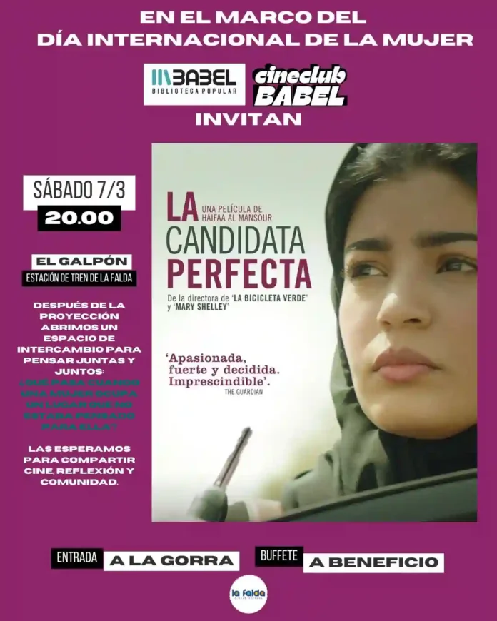 Cine en La Babel: «La candidata perfecta»Qué hay para hacerPor Redacción FacebookTwitterWhatsApp Fecha: 7 de marzoHora: 20:00Lugar: Galpón de la Biblioteca Popular Babel – Av. España s/n (Estación de tren)Entrada: a la gorra + mini buffet Todas las actividadesQué hay para hacerMásTodo lo que hay para hacer, siempre en nuestra agenda Qué hay para hacer La temporada quedó atrás, pero ya sabés que, poco... Más infoDía de la Mujer en La Cumbre Qué hay para hacerSábado 7 de marzo 14:30 - Ciclismo, running y... Más infoMúsica en La Cumbre: Guillermo Dezi «Argentina en la guitarra» Qué hay para hacer Fecha: 7 de marzoHora: 20:30Lugar: Microcine Sala Caraffa -... Más infoDía de la Mujer en Los Cocos Qué hay para hacer Fecha: 7 de marzoHora: 11:00 a 14:00Lugar: Club Atlético... Más infoMujeres en Escena, un homenaje a la creatividad femenina en Capilla del Monte Qué hay para hacer Fecha: 7 de marzoHora: 20:30Lugar: Cine Teatro Enrique MuiñoActividad gratuitaArte - Música... Más infoMes de la Mujer en San Esteban Qué hay para hacer Cronograma de actividades Más infoCine en Capilla del Monte: «Hoppers, operación castor» Qué hay para hacer Fecha: del 5 al 9 de marzoHorarios:Jueves, viernes... Más infoFeria de artesanos en La Falda Qué hay para hacer Sábados y domingosHora: 10:00 a 20:00Lugar: Paseo Trenkel - Avenida Edén... Más infoFeria de artesanos de Villa Giardino Qué hay para hacer Fecha: Viernes y sábados de marzoHora: 18:00Lugar: Plaza San... Más info
