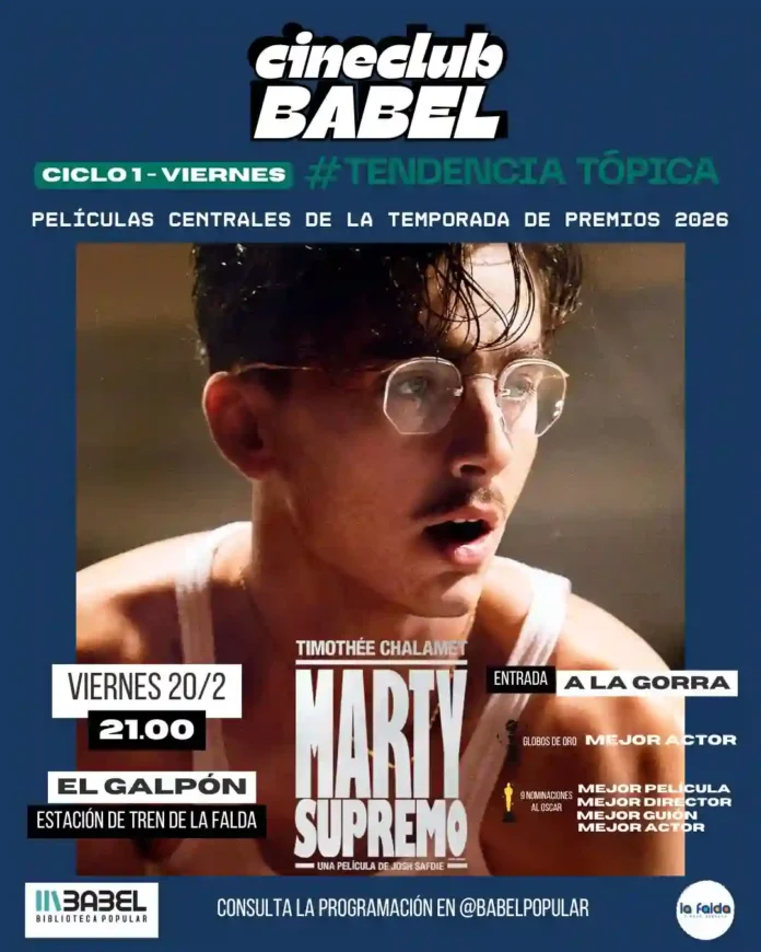 Cine en La Babel: «Marty Supremo» Qué hay para hacer Por Redacción FacebookTwitterWhatsApp Fecha: 20 de febrero Hora: 21:00 Lugar: Galpón de la Biblioteca Popular Babel – Av. España s/n (Estación de tren) A la gorra Todas las actividadesQué hay para hacerMás Pase y vea todo lo que hay para hacer este finde Qué hay para hacer Caminatas, cine, teatro, circo, ferias, magia, música en vivo…... Más info Visitas guiadas diurnas y nocturnas al Hotel Edén Qué hay para hacer 𝗩𝗶𝘀𝗶𝘁𝗮𝘀 𝗴𝘂𝗶𝗮𝗱𝗮𝘀 𝗱𝗶𝘂𝗿𝗻𝗮𝘀 (sin reserva previa) _Todos los días de... Más info Teatro en La Nogalera: «Se empieza por la huida» Qué hay para hacer Fecha: 20 de febrero Hora: 21:00 Lugar: Av. San Martín 357 - Villa... Más info Circo Lotus en La Cumbre Qué hay para hacer Fecha: 20 de febrero Hora: 18:00 Lugar: Sala Luis Berti - Belgrano 495 Actividad gratuita Más info Cine en Capilla del Monte: «GOAT, La cabra que cambió el juego» y «Cumbres borrascosas» Qué hay para hacer "GOAT, La cabra que cambió el juego" Fecha: del viernes... Más info Semana de la Cultura en Villa Giardino Qué hay para hacer Fecha: del 19 al 21 de febrero Jueves 19 –... Más info Vittorio Magia en La Falda Qué hay para hacer Fecha: 20 de febrero Hora: 21:00 Lugar: Salón Leopoldo Marechal -... Más info Carnaval en Huerta Grande Qué hay para hacer Fecha: 20 de febrero Hora: 20:30 Lugar: Av. San Martín Actividad gratuita Más info Teatro en Valle Hermoso: «La máquina de contar cuentos» Qué hay para hacer Fecha: 20 de febrero Hora: 20:00 Lugar: exhotel Buenos Aires (Remedios... Más info