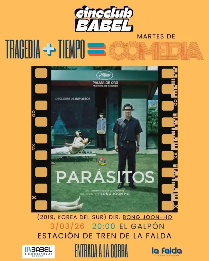 Cine en La Babel: «Parásitos»Qué hay para hacerPor Redacción FacebookTwitterWhatsApp Fecha: 3 de marzoHora: 20:00Lugar: Galpón de la Biblioteca Popular Babel – Av. España s/n (Estación de tren)A la gorra Todas las actividadesQué hay para hacerMásMuseo de Arte Luis José Pisano en La Cumbre Qué hay para hacer Fecha: lunes, martes, jueves, sábados y domingosHora: 9:00 a... Más infoMuseo Ambato de La Falda Qué hay para hacer Viernes y sábados: 10:30 a 13:30 - 17:30 a... Más info