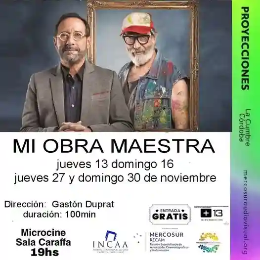 Cine en La Cumbre: «Mi obra maestra»Qué hay para hacerPor Redacción FacebookTwitterWhatsApp Fecha: 13, 16, 27 y 30 de noviembreHora: 19:00Lugar: Microcine Sala CaraffaEntrada gratuita Todas las actividadesQué hay para hacerMásTodo lo que hay para hacer entresemana Qué hay para hacer Te contamos todo lo que hay para hacer entresemana... Más infoMuestra en La Cumbre: «La máquina, sueños y mentiras» Qué hay para hacer Hasta el 14 de diciembreHorarios:_De lunes a sábado... Más infoBicicleteada y caminatas en La Falda Qué hay para hacer BicicleteadaLunes y viernes - 8:30 - Secretaría de... Más infoCine Francés en La Cumbre: «En roue libre» Qué hay para hacer Día: 11 de noviembreHora: 19:00Lugar: Microcine Sala Caraffa (Tassano... Más infoCine en Capilla del Monte: «Paw Patrol: especial navidad» Qué hay para hacer Fechas: 13, 14, 16 y 17 de noviembreHora: 19:30Lugar:... Más infoVuelta Sierras de Córdoba en La Falda y Villa Giardino Qué hay para hacer Fecha: del 14 al 16 de noviembre Más infoJazz en La Cumbre: Cielo Manouche con su Gypsy Swing Qué hay para hacer Fecha: 14 de noviembreHora: 20:00Lugar: Sala Caraffa - Tassano... Más infoCuarta edición de «Literatura en las Sierras» en Capilla del Monte Qué hay para hacer Fecha: del 14 al 16 de noviembreEntrada gratuita Más infoMuestra «Colores de La Cumbre»: fotografías de Coque Gainza Qué hay para hacer Fecha: 14 de noviembreHora: 18:00Lugar: Casa Museo Manuel Mujica Lainez - Cruz... Más info