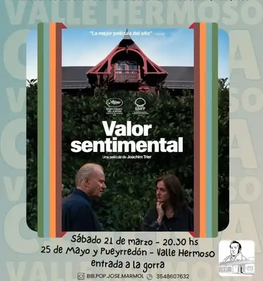 Cine en La Mármol: «Valor Sentimental» Qué hay para hacer Por Redacción FacebookTwitterWhatsApp Fecha: 21 de febrero Hora: 20:30 Lugar: Biblioteca Popular José Mármol – 25 de Mayo y Pueyrredón – Valle Hermoso Entrada a la gorra Todas las actividadesQué hay para hacerMás Agenda XL: música, cine, teatro y todo lo que hay para hacer este finde largo Qué hay para hacer Arranca el finde largo con un montón de actividades... Más info Cine en Capilla del Monte: «Playa de Lobos» Qué hay para hacer Fecha: del 19 al 23 de marzo Hora: 20:30 Lugar: Cine Teatro... Más info Cine de terror en La Cumbre: «El Tema del Verano» Qué hay para hacer Fecha: 20 de marzo Hora: 20:30 Lugar: Microcine Sala Caraffa - Tassano 55 Entrada: 5... Más info Feria de artesanos de Villa Giardino Qué hay para hacer Fecha: Viernes y sábados de marzo Hora: 18:00 Lugar: Plaza San... Más info Museo Ambato de La Falda Qué hay para hacer Viernes y sábados: 10:30 a 13:30 - 17:30 a... Más info Cine en La Babel: «Don nadie contra Putin» Qué hay para hacer Fecha: 20 de marzo Hora: 20:00 Lugar: Galpón de la Biblioteca Popular Babel... Más info Carrera de bicis infantil en La Cumbre Qué hay para hacer Fecha: 21 de marzo Hora: 17:30 Lugar: Plaza San Martín Entrada gratuita Más info Presentación del libro «El monte en llamas» en el Espacio Viarava Qué hay para hacer Fecha: 21 de marzo Hora: 20:30 Lugar: Espacio Viarava - Yrigoyen... Más info Teatro en La Falda: «C.O.L.E.R.E» Qué hay para hacer Fecha: 21 de marzo Hora: 21:00 Lugar: Biblioteca Popular Sarmiento -... Más info