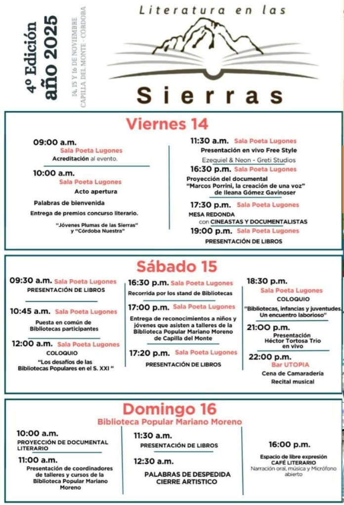 Cuarta edición de «Literatura en las Sierras» en Capilla del MonteQué hay para hacerPor Redacción FacebookTwitterWhatsApp Fecha: del 14 al 16 de noviembreEntrada gratuita Todas las actividadesQué hay para hacerMásTodo lo que hay para hacer entresemana Qué hay para hacer Te contamos todo lo que hay para hacer entresemana... Más infoMuestra en La Cumbre: «La máquina, sueños y mentiras» Qué hay para hacer Hasta el 14 de diciembreHorarios:_De lunes a sábado... Más infoBicicleteada y caminatas en La Falda Qué hay para hacer BicicleteadaLunes y viernes - 8:30 - Secretaría de... Más infoCine Francés en La Cumbre: «En roue libre» Qué hay para hacer Día: 11 de noviembreHora: 19:00Lugar: Microcine Sala Caraffa (Tassano... Más infoCine en La Cumbre: «Mi obra maestra» Qué hay para hacer Fecha: 13, 16, 27 y 30 de noviembreHora: 19:00Lugar:... Más infoVuelta Sierras de Córdoba en La Falda y Villa Giardino Qué hay para hacer Fecha: del 14 al 16 de noviembre Más infoJazz en La Cumbre: Cielo Manouche con su Gypsy Swing Qué hay para hacer Fecha: 14 de noviembreHora: 20:00Lugar: Sala Caraffa - Tassano... Más infoMuestra «Colores de La Cumbre»: fotografías de Coque Gainza Qué hay para hacer Fecha: 14 de noviembreHora: 18:00Lugar: Casa Museo Manuel Mujica Lainez - Cruz... Más infoMuseo Ambato de La Falda Qué hay para hacer Viernes y sábados:10:30 a 13:30 - 15:30 a 18:30Lugar:... Más info