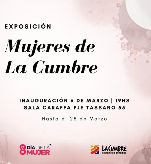 Exposición “Mujeres de La Cumbre” Qué hay para hacer Por Redacción FacebookTwitterWhatsApp Fecha de inauguración: 6 de marzo (hasta el 28 de marzo) Hora: 19:00 Lugar: Sala Caraffa – Pje. Tassano 55 Entrada gratuita Todas las actividadesQué hay para hacerMás Todo lo que hay para hacer, siempre en nuestra agenda Qué hay para hacer La temporada quedó atrás, pero ya sabés que, poco... Más info Cine en Capilla del Monte: «Hoppers, operación castor» Qué hay para hacer Fecha: del 5 al 9 de marzo Horarios: Jueves, viernes... Más info Mes de la Mujer en La Falda: caminata Qué hay para hacer Fecha: 6 de marzo Hora: 18:00 Lugar: Paseo Trenkel Actividad gratuita Más info Cine en La Babel: «Los domingos» Qué hay para hacer Fecha: 6 de marzo Hora: 20:00 Lugar: Galpón de la Biblioteca Popular Babel –... Más info Mes de la Mujer en San Esteban Qué hay para hacer Cronograma de actividades Más info Música en La Cumbre: Victor Renaudeau Qué hay para hacer Fecha: 6 de marzo Hora: 21:00 Lugar: Sala Caraffa - Tassano... Más info Día de la Mujer en La Cumbre Qué hay para hacer Sábado 7 de marzo 14:30 - Ciclismo, running y... Más info Música en La Cumbre: Guillermo Dezi «Argentina en la guitarra» Qué hay para hacer Fecha: 7 de marzo Hora: 20:30 Lugar: Microcine Sala Caraffa -... Más info Día de la Mujer en Los Cocos Qué hay para hacer Fecha: 7 de marzo Hora: 11:00 a 14:00 Lugar: Club Atlético... Más info