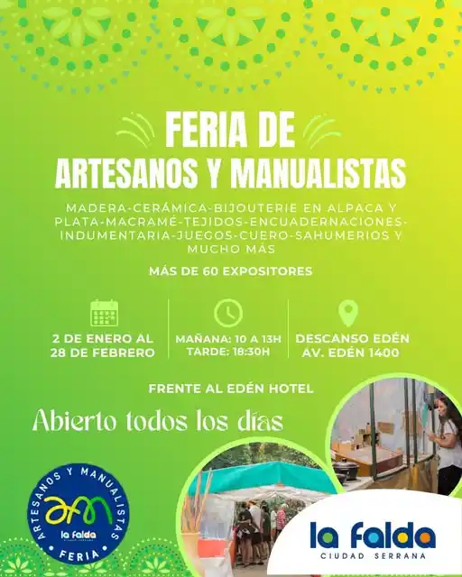 Feria de artesanos en La FaldaQué hay para hacerPor Redacción FacebookTwitterWhatsApp Fechas: del 2 de enero al 28 de FebreroHora: 10:00 a 13:00 y a partir de las 18:30Lugar: Paseo Trenkel – Avenida Edén 1400Actividad gratuita Todas las actividadesQué hay para hacerMásTodo lo que hay para hacer entresemana Qué hay para hacer Te seguimos contando todo lo que hay para hacer... Más infoCine en La Babel: «Buenos días» Qué hay para hacer Fecha: 20 de eneroHora: 21:00Lugar: Galpón de la Biblioteca... Más infoZumba en Capilla del Monte Qué hay para hacer Fecha: martes y juevesHora: 19:00Lugar: Balneario CalabalumbaActividad gratuita Más infoCaminatas matutinas en Capilla del Monte Qué hay para hacer Fecha: martes y juevesHora: 8:00Lugar: Oficina de TurismoActividad gratuita Más infoYoga en Capilla del Monte Qué hay para hacer Fecha: martes y juevesHora: 10:00Lugar: Balneario CalabalumbaActividad gratuita Más infoTributo a Cacho Castaña en Capilla del Monte Qué hay para hacer Fecha: 20 de eneroHora: 20:00Lugar: Cine Teatro Enrique MuiñoEntrada:... Más infoLa Falda en bici Qué hay para hacer Todos los martesHora: 19:30Lugar: Secretaría de Turismo (Av. Edén... Más infoCaminatas en Valle Hermoso Qué hay para hacer Martes y juevesHora: 8:00Lugar: Parador Valle (Perón 100)Actividad gratuita Más infoTeatro Edén: Gladys Florimonte Qué hay para hacer Fecha: 20 y 27 de eneroHora: 22:30Lugar: Avenida Eden... Más info