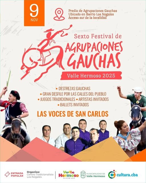 Festival de Agrupaciones Gauchas en Valle Hermoso Qué hay para hacer Por Redacción FacebookTwitterWhatsApp Fecha: 9 de noviembre Lugar: Centro Tradicionalista «Los Nogales» (acceso sur) Todas las actividadesQué hay para hacerMás Todo lo que hay para hacer entresemana Qué hay para hacer Te contamos todo lo que hay para hacer entresemana... Más info Muestra en La Falda: “Lo Orgánico como Lenguaje” Qué hay para hacer Día: hasta el 31 de octubre Horarios del Hotel Edén Lugar:... Más info Museos de La Cumbre Qué hay para hacer Más info Muestra de arte en Huerta Grande: «Carbocolor» de Daniel Rivero Serradell Qué hay para hacer Duración de la muestra: hasta el 1 de noviembre Horarios De... Más info Cine Francés en La Cumbre: «Quelques Jours Pas Plus» Qué hay para hacer Fecha: 28 de octubre Hora: 19:00 Lugar: Sala Caraffa - Tassano... Más info Fogón de autores en Huerta Grande Qué hay para hacer Fecha: 29 de octubre Hora: 16:00 a 19:00 Lugar: Av. San... Más info Peña por el aniversario de Capilla del Monte Qué hay para hacer Fecha: 30 de octubre 11:00 - Desfile institucional (Plaza San... Más info Gran fiesta popular por el aniversario de La Cumbre Qué hay para hacer Fecha: 30 de octubre Hora: de 10:30 Lugar: Av. Caraffa y Belgrano Actividad gratuita Más info Cine en La Cumbre: «El kiosco» Qué hay para hacer Fecha: 30 de octubre Hora: 19:00 Lugar: Microcine Sala Caraffa – Tassano 55 Entrada gratuita Más info
