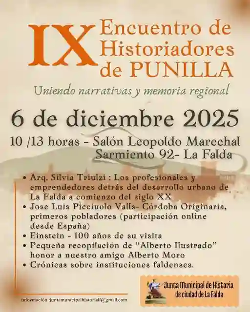 IX Encuentro de Historiadores de Punilla en La FaldaQué hay para hacerPor Redacción FacebookTwitterWhatsApp Fecha: 6 de diciembreHora: 10:00 a 13:00Lugar: Salón Leopoldo Marechal – Sarmiento 92Actividad gratuita Todas las actividadesQué hay para hacerMásTodo lo que hay para hacer, siempre en nuestra agenda Qué hay para hacer Poco a o mucho, si hay algo para hacer... Más infoCine en Capilla del Monte: «Zootopia 2» Qué hay para hacer Fechas: del 27 de noviembre al lunes 1 de... Más infoFeria del libro en San Esteban Qué hay para hacer Fecha: 28, 29 y 30 de noviembreLugar: Centro de Integración... Más infoMuestra en La Cumbre: «La máquina, sueños y mentiras» Qué hay para hacer Hasta el 14 de diciembreHorarios:_De lunes a sábado... Más infoMuestra «Colores de La Cumbre»: fotografías de Coque Gainza Qué hay para hacer Hasta el 30 de diciembreDías y hora: sábados y domingos,... Más infoExposición de Cecilia Bisignano en La Falda Qué hay para hacer Fecha: miércoles a domingosHora: 19:00Lugar: Diagonal Sud 200Entrada gratuita Más infoCine en La Nogalera: «Cuando cae el otoño» Qué hay para hacer Fecha: 30 de noviembreHora: 20:00Lugar: San Martín 357 -... Más infoCine en La Cumbre: «Mi obra maestra» Qué hay para hacer Fecha: 30 de noviembreHora: 19:00Lugar: Microcine Sala CaraffaEntrada gratuita Más infoCine Francés en La Cumbre: «Un singer en hiver» Qué hay para hacer Día: 2 de diciembreHora: 19:00Lugar: Microcine Sala Caraffa (Tassano... Más info