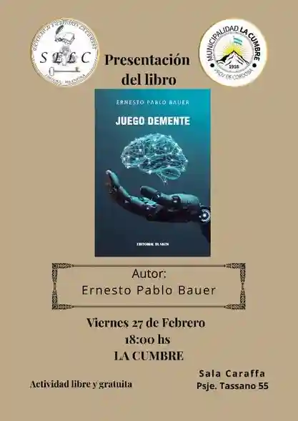 La Cumbre: presentación del libro Juego Demente, de Ernesto Pablo BauerQué hay para hacerPor Redacción FacebookTwitterWhatsApp Fecha: 27 de febreroHora: 18:00Lugar: Sala Caraffa – Tassano 55Entrada gratuita Todas las actividadesQué hay para hacerMásSe va la temporada, pero esta agenda sigue: todo lo que hay para hacer Qué hay para hacer Termina febrero; se despide la temporada, pero esta agenda... Más infoCaminata a la Cascada de Olmos en Huerta Grande Qué hay para hacer Fecha: viernes y domingosHora: 8:00Lugar: 9 de julio y ChacoActividad gratuita Más infoCine en La Babel: «Los Pecadores» Qué hay para hacer Fecha: 27 de febreroHora: 21:00Lugar: Galpón de la Biblioteca... Más infoCine en Capilla del Monte: «Hoppers» y «Cumbres borrascosas» Qué hay para hacer"Hoppers, operación castor"Fecha: sábado 28 de febrero - domingo... Más infoFeria de artesanos de Villa Giardino Qué hay para hacer Fecha: desde el 27 de diciembre (todos los días)Hora:... Más infoMuseo Ambato de La Falda Qué hay para hacer Viernes y sábados: 10:30 a 13:30 - 17:30 a... Más infoYoga en La Falda Qué hay para hacer Sábado - 8:30_Plaza San MartínLunes - 8:00_Centro Vecinal... Más infoArtistas al paso en La Falda Qué hay para hacer Sábados y domingos de enero y febreroHora: 21:00Lugar: Avenida... Más infoPresentación en La Mármol: «Alna, la dinosaurio más pequeña» Qué hay para hacer Fecha: 28 de febreroHora: 18:00Lugar: Biblioteca Popular José Mármol - 25 de... Más info