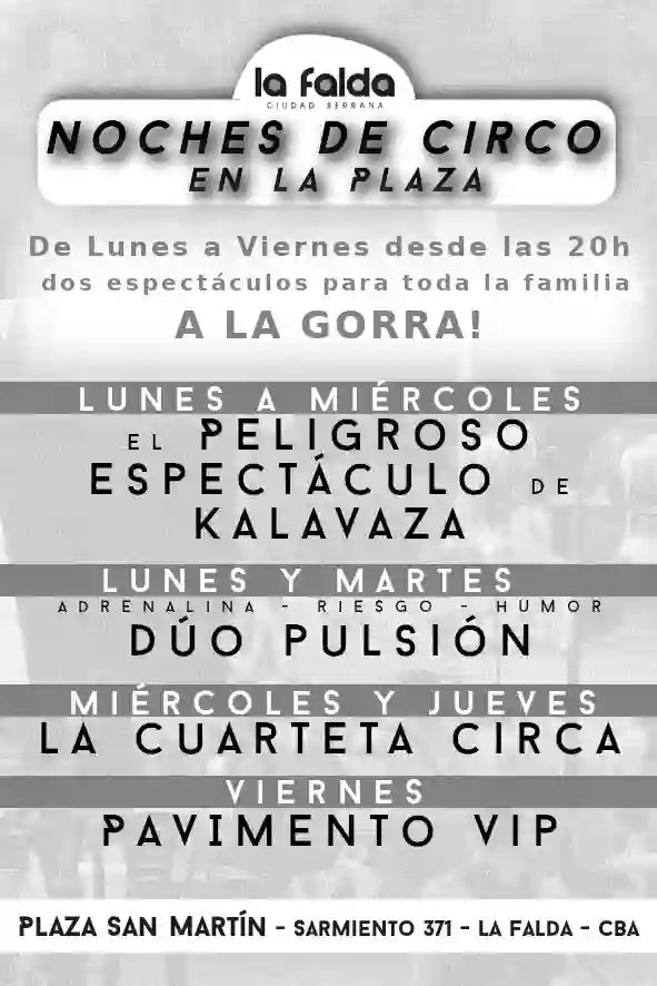 La Falda: noches de circo en la plaza Qué hay para hacer Por Redacción FacebookTwitterWhatsApp Fecha: lunes a viernes Hora: 20:30 Lugar: Plaza San Martín Espectáculoa a la gorra Todas las actividadesQué hay para hacerMás Todo lo que hay para hacer entresemana Qué hay para hacer Te seguimos contando todo lo que hay para hacer... Más info Yoga en La Falda Qué hay para hacer Sábado - 8:30 _Plaza San Martín Lunes - 8:00 _Centro Vecinal... Más info Senderismo al atardecer en Capilla del Monte Qué hay para hacer Fecha: lunes y miércoles Hora: 19:00 Lugar: Oficina de Turismo Actividad gratuita Más info Cine en Capilla del Monte: «GOAT, La cabra que cambió el juego» y «Cumbres borrascosas» Qué hay para hacer "GOAT, La cabra que cambió el juego" Fecha: del viernes... Más info Muestra en Capilla del Monte Qué hay para hacer Fecha: hasta el 3 de marzo Lugar: Sala Poeta Lugones Más info Teatro en La Cumbre: «Es complicado» Qué hay para hacer Fecha: 23 de febrero Hora: 21:00 Lugar: Sala Luis Berti –... Más info Feria de artesanos de Villa Giardino Qué hay para hacer Fecha: desde el 27 de diciembre (todos los días) Hora:... Más info Museo de Arte Luis José Pisano en La Cumbre Qué hay para hacer Fecha: lunes, martes, jueves, sábados y domingos Hora: 9:00 a... Más info Teatro Edén: Unipersonal de Gladys Florimonte Qué hay para hacer Fecha: todos los martes Hora: 23:00 Lugar: Avenida Edén 1400 – La Falda Entradas: 20... Más info