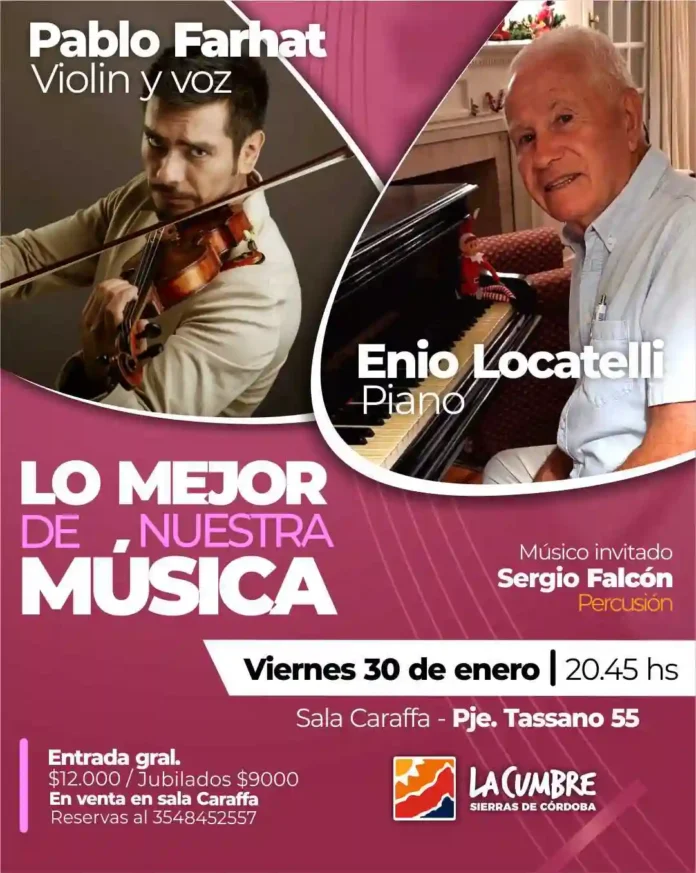 Lo mejor de nuestra música en La CumbreQué hay para hacerPor Redacción FacebookTwitterWhatsApp Fecha: 30 de eneroHora: 20:45Lugar: Sala Caraffa – Tassano 55Entrada: $12.000 – Jubilados $9.000 Todas las actividadesQué hay para hacerMás¿Pinta hacer algo este finde? Pegáte una vuelta por nuestra agenda Qué hay para hacer Música en vivo, ferias, teatro, cine, caminatas, espectáculos infantiles,... Más infoMuseo Ambato de La Falda Qué hay para hacer Viernes y sábados: 10:30 a 13:30 - 17:30 a... Más infoBailar la plaza en La Falda Qué hay para hacer Todos los domingosHora: 20:00Lugar: Plaza San MartínA la gorra Más infoArtistas al paso en La Falda Qué hay para hacer Sábados y domingos de enero y febreroHora: 20:00Lugar: Avenida... Más infoCine y Mate en Villa Giardino: Mente Maestra Qué hay para hacer Fecha: 25 de eneroHora: 21:00Lugar: Boulevard La Flores 36... Más infoLa Falda bajo las estrellas: Baglietto Vitale Qué hay para hacer Fecha: 25 de enero - Baglietto Vitale, Contramano Tango 4,... Más infoCine en Capilla del Monte: Zootopia 2 Qué hay para hacer Fecha y hora:Jueves 22 - 20:00 (Función... Más infoMuestra en Capilla del Monte: “La Mirada Hiperbórea” Qué hay para hacer Del 16 de enero al 3 de febreroHora: 19:00Lugar: Sala Poeta... Más infoMagia en La Falda: Vittorio Qué hay para hacer Fecha: 23 de eneroHora: 21:00Lugar: Salón Leopoldo Marechal (Sarmiento 92)Espectáculo a la... Más info