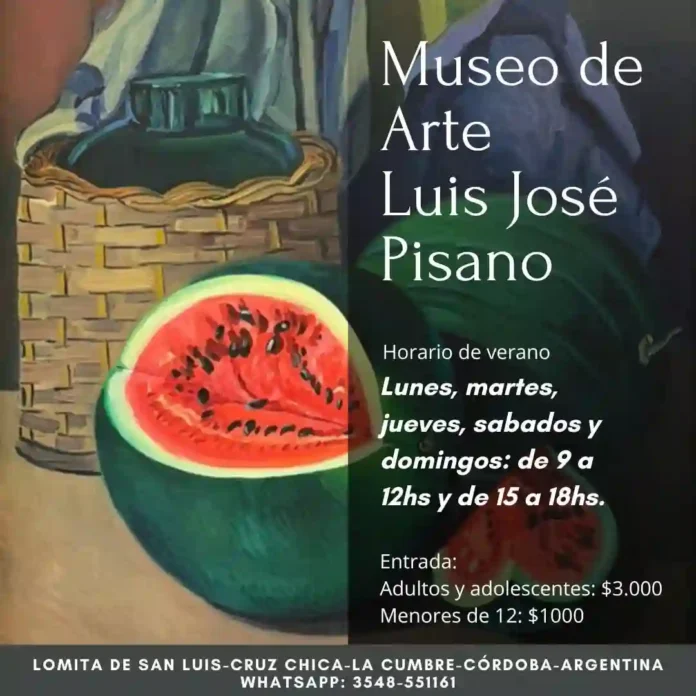 Museo de Arte Luis José Pisano en La CumbreQué hay para hacerPor Redacción FacebookTwitterWhatsApp Fecha: lunes, martes, jueves, sábados y domingosHora: 9:00 a 12:00 – 15:00 a 18:00Lugar: Lomita de San Luis – Cruz ChicaEntrada: $3 mil – menores de 12 años $10 mil Todas las actividadesQué hay para hacerMásLa agenda no para: todo lo que hay para hacer entresemana Qué hay para hacer La temporada sigue y nuestra agenda no para. Te... Más infoCine en Capilla del Monte: Avatar Qué hay para hacerJueves 8 y sábado 10 de enero - 17:00... Más infoYoga en La Falda Qué hay para hacer Sábado - 8:30_Plaza San MartínLunes - 8:00_Centro Vecinal... Más infoSenderismo al atardecer en Capilla del Monte Qué hay para hacer Fecha: lunes y miércolesHora: 19:00Lugar: Oficina de TurismoActividad gratuita Más infoLa Falda: noches de circo en la plaza Qué hay para hacer Fecha: lunes a viernesHora: 20:30Lugar: Plaza San MartínEspectáculoa a la gorra Más infoCine familiar en Valle Hermoso: Las Guerreras K-POP Qué hay para hacer Fecha: 12 de eneroHora: 20:30Lugar: Plaza Manuel BelgranoEntrada gratuita Más infoPaquito Ocaño en vivo en Capilla del Monte Qué hay para hacer Fecha: 12 de eneroHora: 16:00Lugar: Balneario CalabalumbaEntrada gratuita Más infoTeatro Edén: Gladys Florimonte Qué hay para hacer Fecha: 12, 20 y 27 de eneroHora: 22:30Lugar: Avenida... Más infoCine en La Babel: Los enredos de Wanda Qué hay para hacer Fecha: 13 de eneroHora: 21:00Lugar: Galpón de la Biblioteca... Más info