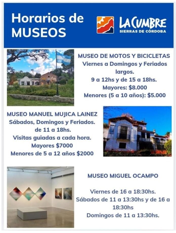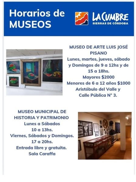 Museos de La Cumbre Qué hay para hacer Por Redacción FacebookTwitterWhatsApp Todas las actividadesQué hay para hacerMás Todo lo que hay para hacer, siempre en nuestra agenda Qué hay para hacer Algo de cine, un poco de música en vivo,... Más info Cine en Capilla del Monte: «Teléfono negro 2» Qué hay para hacer Fechas: Jueves 23 - subtitulada del viernes 24 al lunes... Más info Cine en La Nogalera: «La novicia rebelde» Qué hay para hacer Fecha: 25 de octubre Hora: 18:00 Lugar: San Martín 357 - Villa... Más info Muestra de arte en Huerta Grande: «Carbocolor» de Daniel Rivero Serradell Qué hay para hacer Duración de la muestra: hasta el 1 de noviembre Horarios De... Más info Música en La Cumbre: Martín Oliva presenta “Folclore Urbano” Qué hay para hacer Fechas: 25 de octubre Hora: 20:00 Lugar: Sala Caraffa - Tassano... Más info La Cumbre en Flor: exposición de flores en La Cumbre Qué hay para hacer Fecha: 25 de octubre Hora: 17:00 a 20:00 Lugar: Sala Caraffa... Más info Feria de artesanos, manualistas y productores en Villa Giardino Qué hay para hacer Fecha: 25 de octubre Hora: 15:00 Lugar: Plaza San Martín Más info Museo Ambato de La Falda Qué hay para hacer Viernes y sábados:10:30 a 13:30 - 15:30 a 18:30 Lugar:... Más info Cine en La Cumbre: «La odisea de los giles» Qué hay para hacer Fecha: 26 de octubre Hora: 19:00 Lugar: Microcine Sala Caraffa – Tassano 55 Entrada gratuita Más info