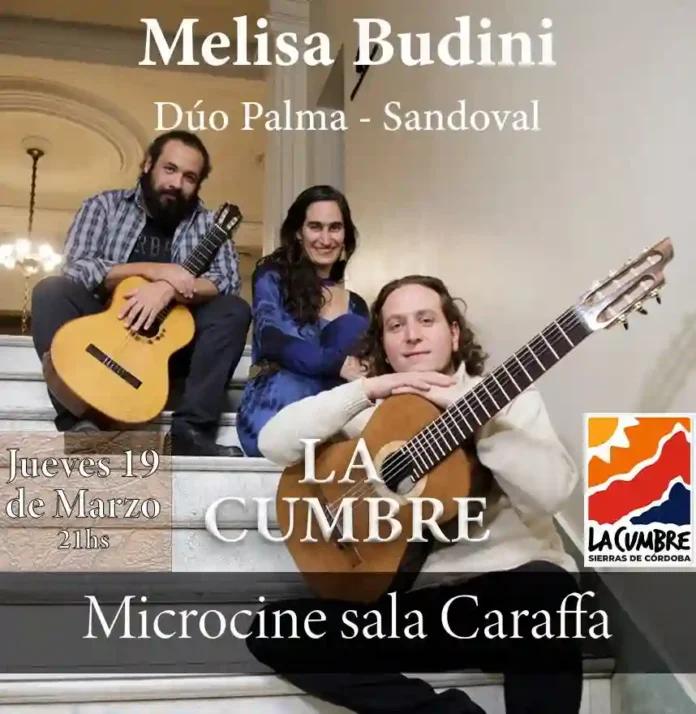 Música en La Cumbre: Melisa Budini y Duo Palma Sandoval Qué hay para hacer Por Redacción FacebookTwitterWhatsApp Fecha: 19 de marzo Hora: 21:00 Lugar: Microcine Sala Caraffa – Tassano 55 Entradas: En puerta $15.000 – Jubilados $12.000 Todas las actividadesQué hay para hacerMás Todo lo que hay para hacer entresemana Qué hay para hacer Te seguimos contando todo lo que hay para hacer... Más info Cine en Capilla del Monte: «Scream 7» Qué hay para hacer Fecha: del 12 al 16 de marzo Hora: 20:30 Idioma: jueves... Más info Caminatas en Valle Hermoso Qué hay para hacer Fechas: 12, 17, 19, 24 y 26 de marzo Hora:... Más info Cine Francés en La Cumbre: «Goutte D’Or» Qué hay para hacer Día: 17 de marzo Hora: 20:00 Lugar: Microcine Sala Caraffa (Tassano... Más info Cine en La Babel: «Cientos de castores» Qué hay para hacer Fecha: 17 de marzo Hora: 20:00 Lugar: Galpón de la Biblioteca Popular Babel... Más info Cine en La Cumbre: «Bu y Bu» Qué hay para hacer Fecha: 18 de marzo Hora: 20:00 Lugar: Microcine Sala Caraffa -... Más info Cine de terror en La Cumbre: «El Tema del Verano» Qué hay para hacer Fecha: 20 de marzo Hora: 20:30 Lugar: Microcine Sala Caraffa - Tassano 55 Entrada: 5... Más info Feria de artesanos de Villa Giardino Qué hay para hacer Fecha: Viernes y sábados de marzo Hora: 18:00 Lugar: Plaza San... Más info Museo Ambato de La Falda Qué hay para hacer Viernes y sábados: 10:30 a 13:30 - 17:30 a... Más info