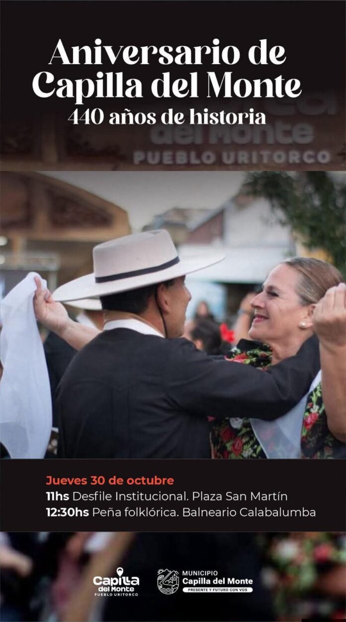 Peña por el aniversario de Capilla del MonteQué hay para hacerPor Redacción FacebookTwitterWhatsApp Fecha: 30 de octubre11:00 – Desfile institucional (Plaza San Martín)12:30 – Peña folklórica – (Balneario Calabalumba)Actividad gratuita Todas las actividadesQué hay para hacerMásTodo lo que hay para hacer, siempre en nuestra agenda Qué hay para hacer Algo de cine, un poco de música en vivo,... Más infoCine en Capilla del Monte: «Teléfono negro 2» Qué hay para hacer Fechas:Jueves 23 - subtituladadel viernes 24 al lunes... Más infoCine en La Nogalera: «La novicia rebelde» Qué hay para hacer Fecha: 25 de octubreHora: 18:00Lugar: San Martín 357 - Villa... Más infoMuestra de arte en Huerta Grande: «Carbocolor» de Daniel Rivero Serradell Qué hay para hacer Duración de la muestra: hasta el 1 de noviembreHorariosDe... Más infoMúsica en La Cumbre: Martín Oliva presenta “Folclore Urbano” Qué hay para hacer Fechas: 25 de octubreHora: 20:00Lugar: Sala Caraffa - Tassano... Más infoLa Cumbre en Flor: exposición de flores en La Cumbre Qué hay para hacer Fecha: 25 de octubreHora: 17:00 a 20:00Lugar: Sala Caraffa... Más infoFeria de artesanos, manualistas y productores en Villa Giardino Qué hay para hacer Fecha: 25 de octubreHora: 15:00Lugar: Plaza San Martín Más infoMuseo Ambato de La Falda Qué hay para hacer Viernes y sábados:10:30 a 13:30 - 15:30 a 18:30Lugar:... Más infoMuseos de La Cumbre Qué hay para hacer Más info