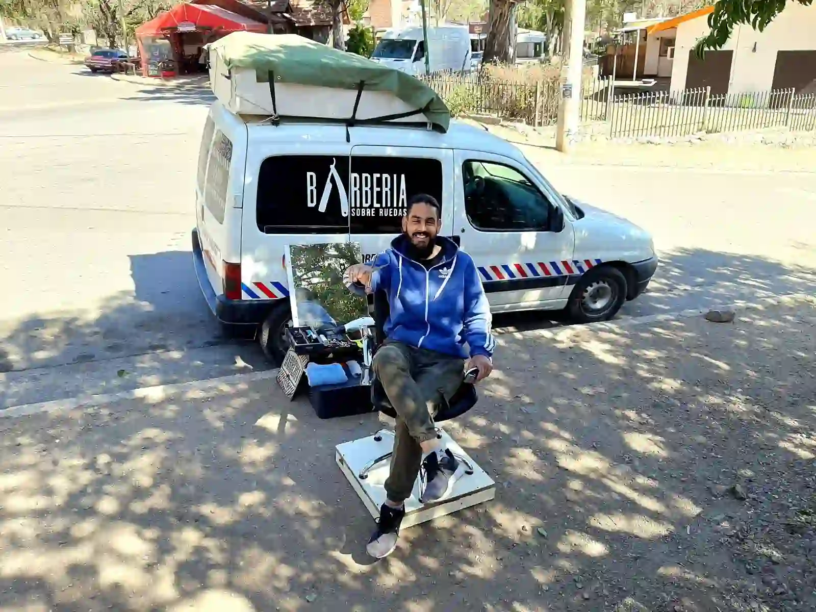Con un paisaje de fondo diferente cada día, maneja su “Barbería sobre ruedas” sin rutina, ni destino final. Hizo base en Capilla del Monte y, tras pasar por San Marcos Sierras, La Cumbre y Los Cocos, este martes se instaló por unas horas en el Paseo Trenkel de La Falda. Al menos hasta noviembre seguirá viajando por Punilla para luego apuntar hacia el norte con el único plan de continuar recolectando historias y nuevas amistades, incluso más allá de los límites de la Argentina.