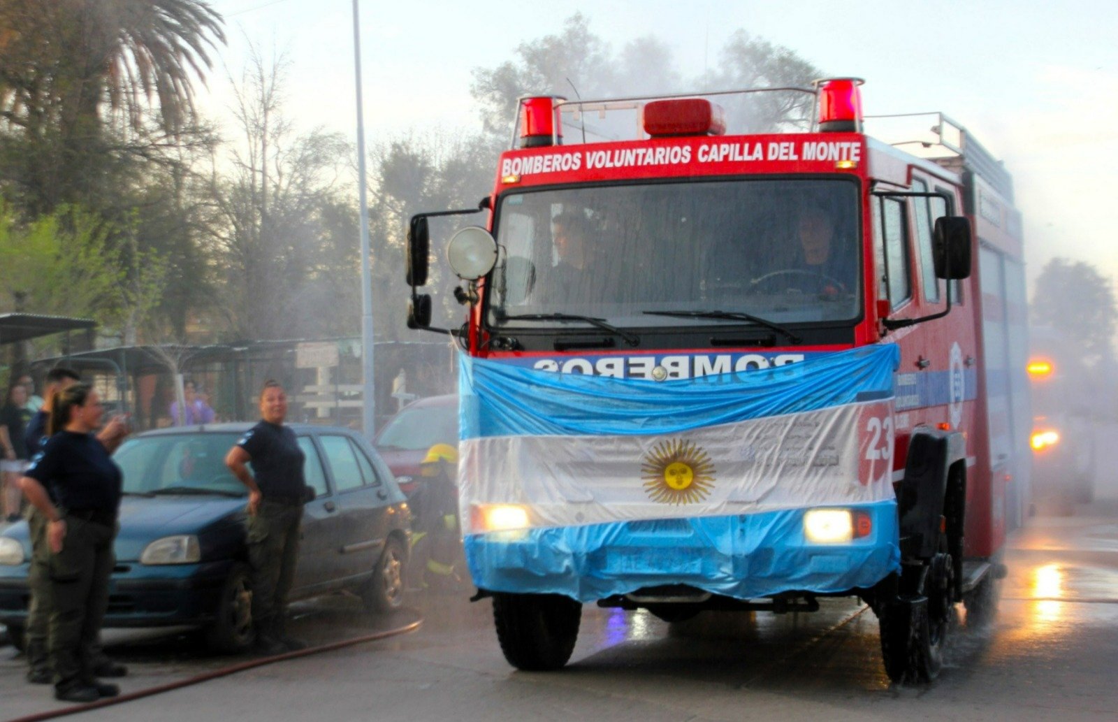 Con el tradicional bautismo de agua, integrantes del Cuerpo Activo de la Asociación de Bomberos Voluntarios de Capilla del Monte presentaron este martes su nueva unidad pesada.