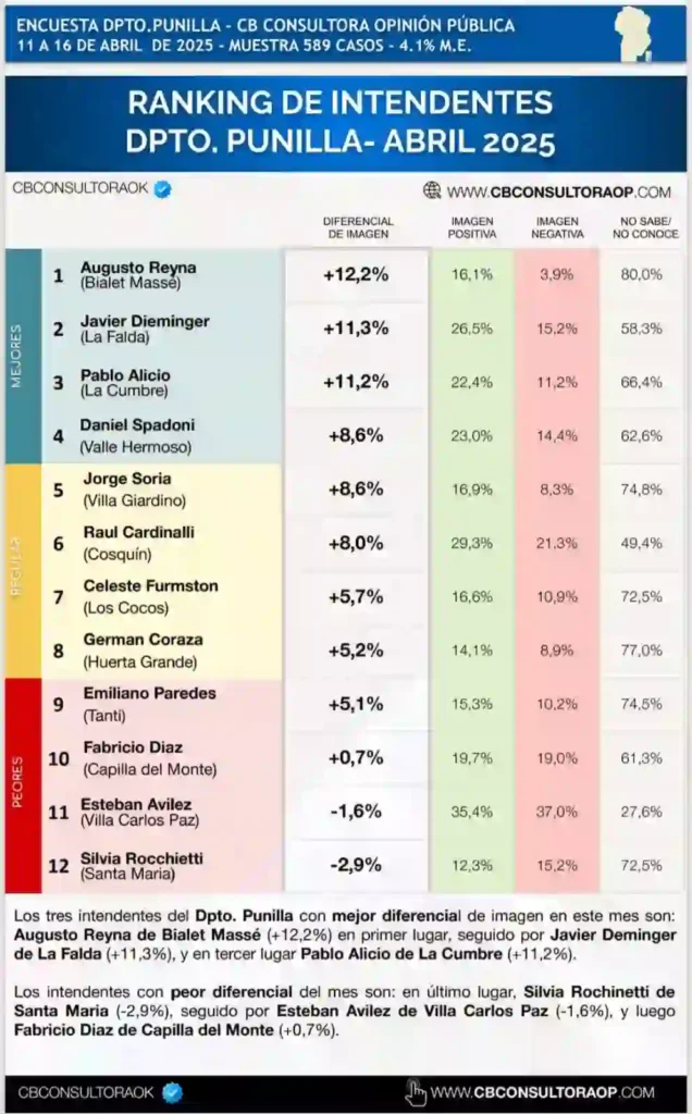 Una encuestadora de Córdoba relevó en ranking a los intendentes de toda la provincia. En Punilla, el top tres lo ocupan Augusto Reyna, de Bialet Massé; Javier Deminger, de La Falda y Pablo Alicio, de La Cumbre.