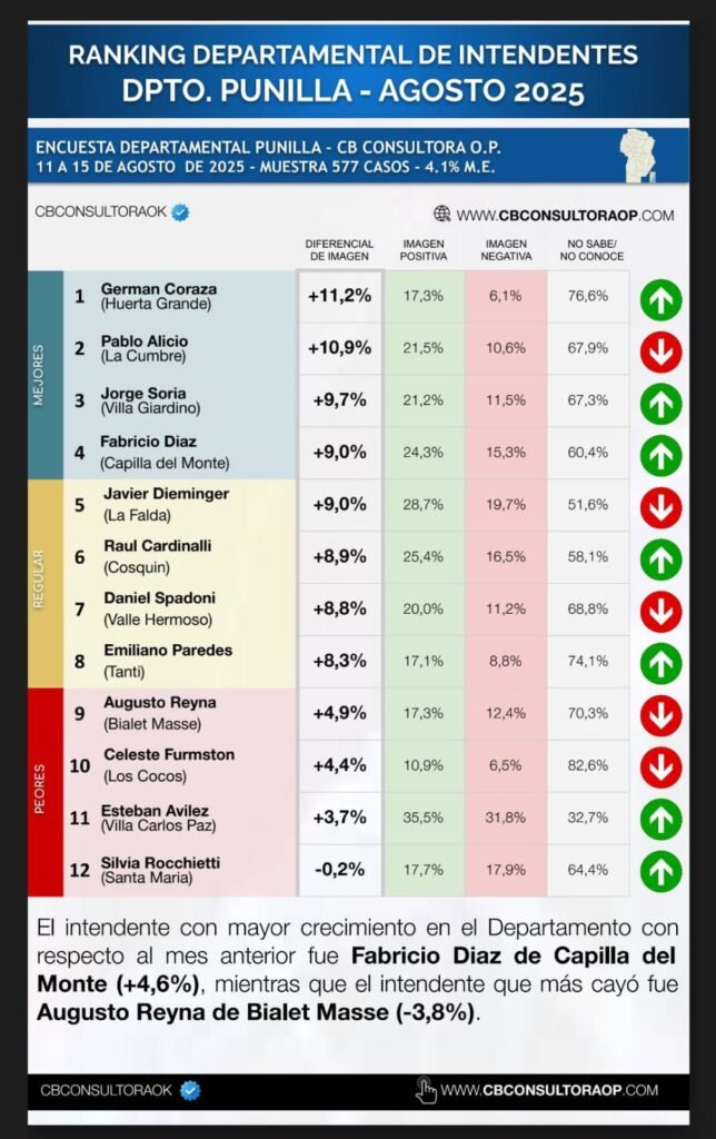 El intendente que más creció fue Fabricio Díaz, de Capilla del Monte, quien quedó cuarto con el 9 por ciento y subió seis puestos (+4,6 por ciento) respecto al mes pasado, publicó CB Consultora.