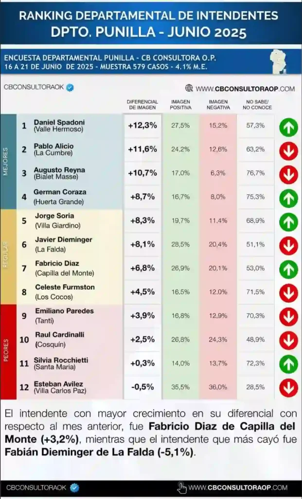 En tanto, en comparación con los resultados de mayo, el intendente con mayor crecimiento fue Fabricio Díaz (Capilla del Monte) con un +3,2 por ciento, mientras quien más cayó fue Javier Dieminger (La Falda) con un -5,1 por ciento. En mayo, Dieminger había liderado el ranking y ahora pasó al sexto puesto.