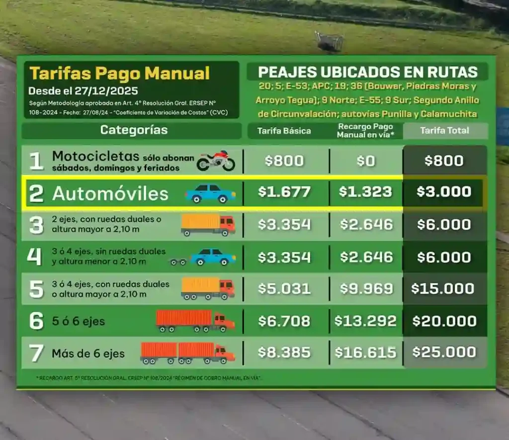 A partir de este sábado, aumentaron los peajes en Córdoba. Los automovilistas (categoría 2), que abonen en efectivo, pagarán 3.000 pesos por pasada.